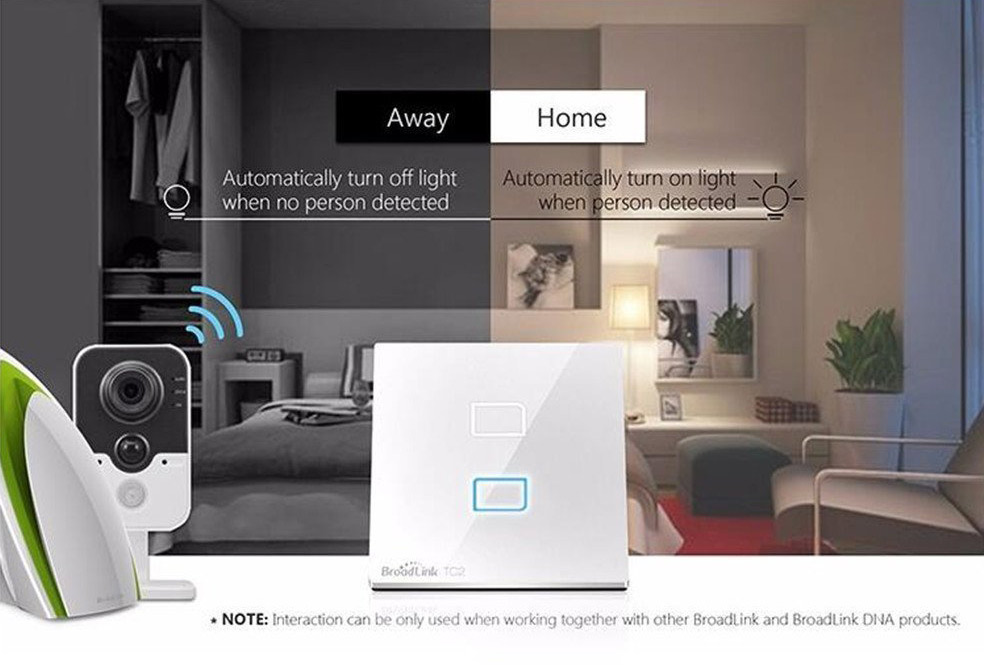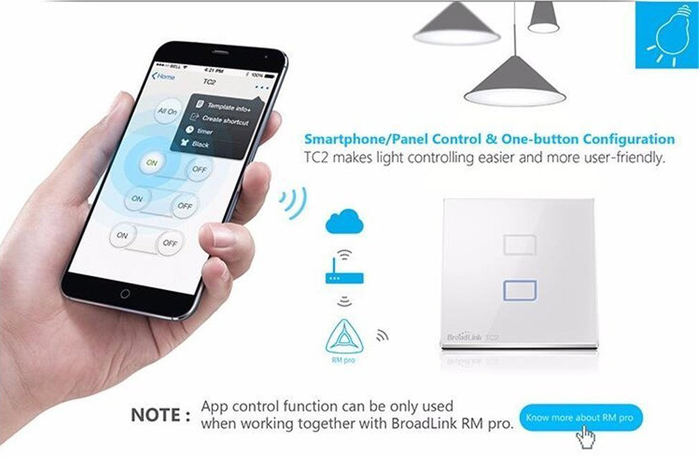 Έξυπνος διακόπτης τοίχου, μπορείτε να ελέγχετε τα φώτα οπουδήποτε μέσω του έξυπνου τηλεφώνου Android/IOS. Πρέπει να το χρησιμοποιείτε μαζί με το BroadLink RM Pro Universal Remote για να ενεργοποιήσετε αυτήν τη λειτουργία ή πρέπει να ενεργοποιήσετε και να απενεργοποιήσετε τα φώτα χειροκίνητα πατώντας τον διακοπτη.